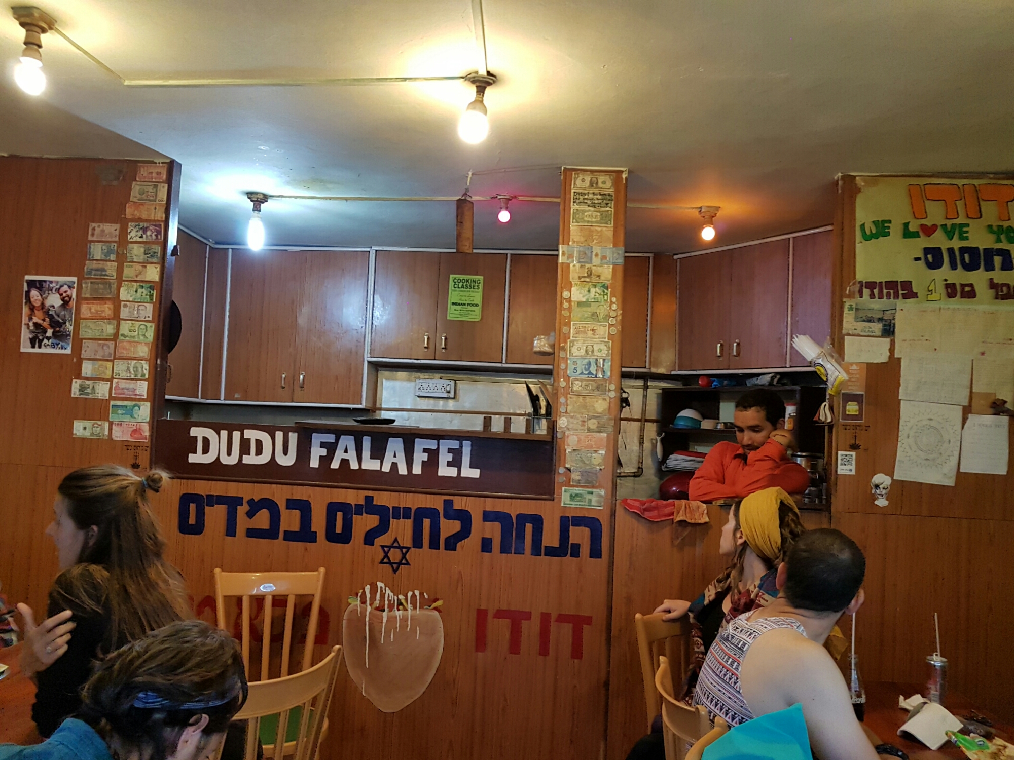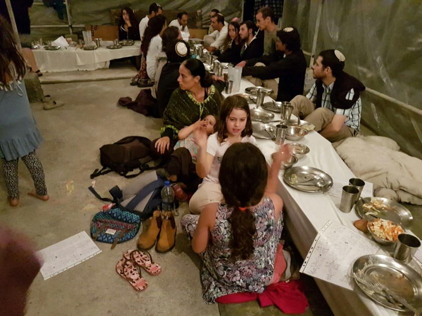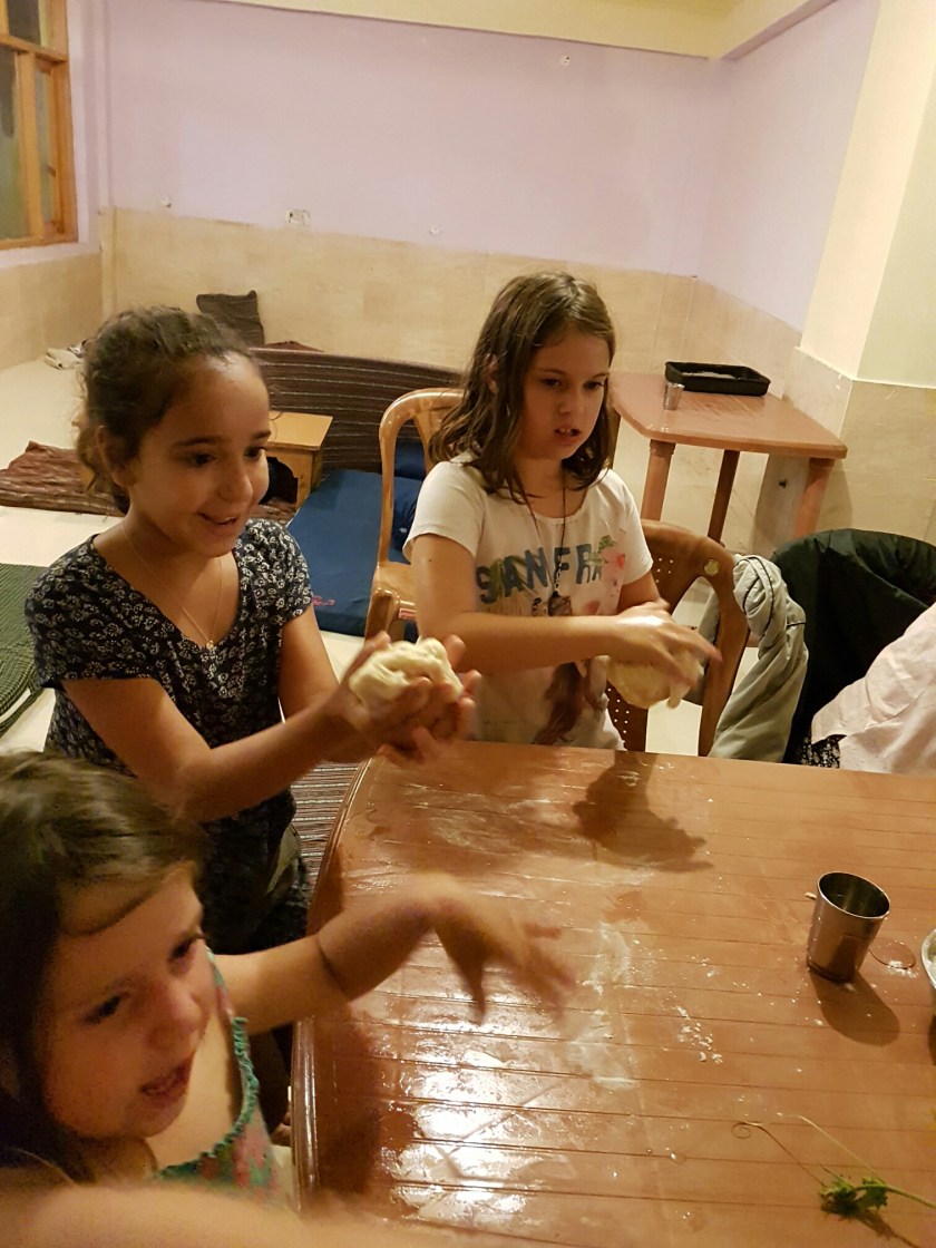 סמוך לשעה שבע החלו מתקבצים צעירים רבים, מקולחים, חגיגיים, במצב רוח טוב. חלקם נשאו עמם כלי נגינה ומייד החלו שרים ומנגנים בנועם עד טכס הדלקת הנרות שסימלה את כניסת השבת. לאחר מכן עלינו לקומה השניה, שם כבר היו דיי הרבה חבר'ה צעירים ישובים סביב השולחנות, מדברים, חלקם מכירים אחד את השני לראשונה. אנחנו היינו אטרקטיביים בגלל הילדים כמובן. אחרי תפילת ערבית (נראה לי) הגיעה מחרוזת שירים/תפילות בזימרה שלוותה בריקודים, הילדות החלו לאבד סבלנות בעקר בגלל שהן היו ממש רעבות, השעה היתה כבר קרוב לשמונה בערב. אך אז הגיעו קעריות עם סלטים, חומוס (כמובן) סלט ירקות, סלט חצילים וחלות טריות, הבנות אכלו קצת ונרגעו. מה שמקסים היה לראות, שלא היו מלצרים מקומיים, אלה המטיילים עצמם, קמים, מפנים, מגישים ומסייעים בתפעול הארוחה, איזה יופי!