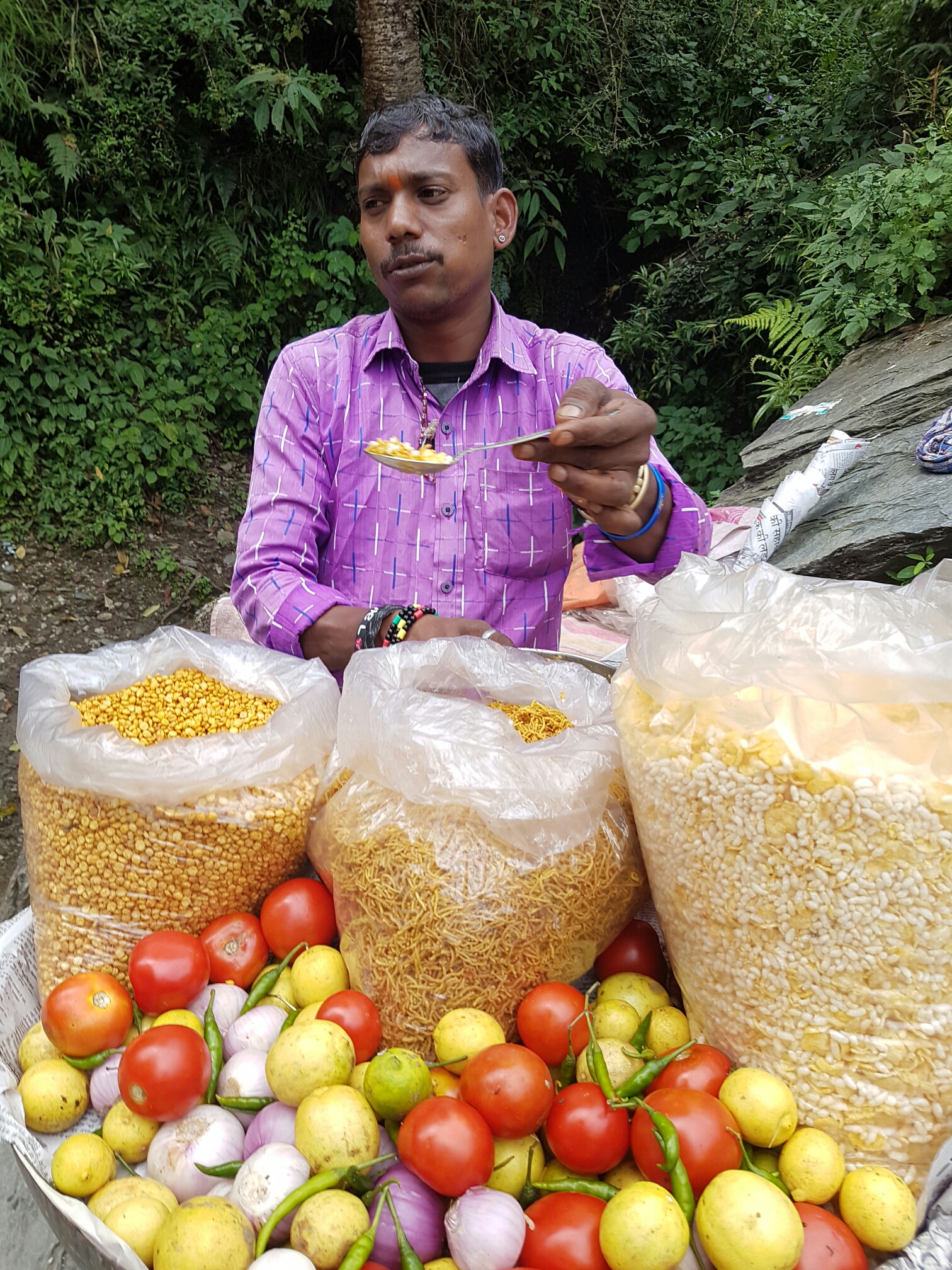 בדרך חזרה מהמפל, עצרנו ליד דוכני האוכל לארוחת צהריים הודית כמנהגנו. והפעם גילינו דוכן של חטיף דגנים הודיים כמו עדשים, חומוס, סויה ועוד כל מיני שלא זיהינו, המוכר ערבב את החטיפים עם מיץ לימון שהוא סוחט ביד אחת, מוסיף תבלין כלשהו, וירקות (אנחנו ויתרנו על הירקות מטעמי בריאות זהירה)