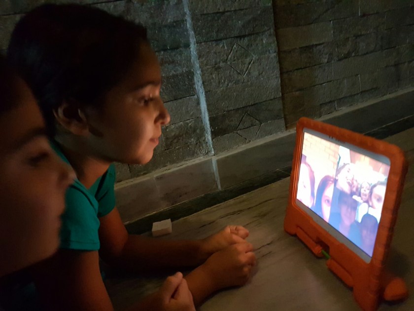 בערב, רוני ואלה קבעו עם חברות שלהן לדבר בסקייפ, ההתרגשות לקראת השיחה היתה גדולה, התקלחנו, הטענו את הטאבלט והמתנו לשעה היעודה, אחרי שהתגברנו על כל מיני בעיות טכניות בצד שלנו ובצד שלהן, הן אפילו הצליחו לשוחח קצת. היה מאוד מרגש, ואני הייתי בטוחה שהן לא יצליחו להירדם בלילה. אבל סרט על הקיר, במקרן שלנו הוריד את ההתרגשות והבנות שקעו לתוך שינה רגועה ונעימה.