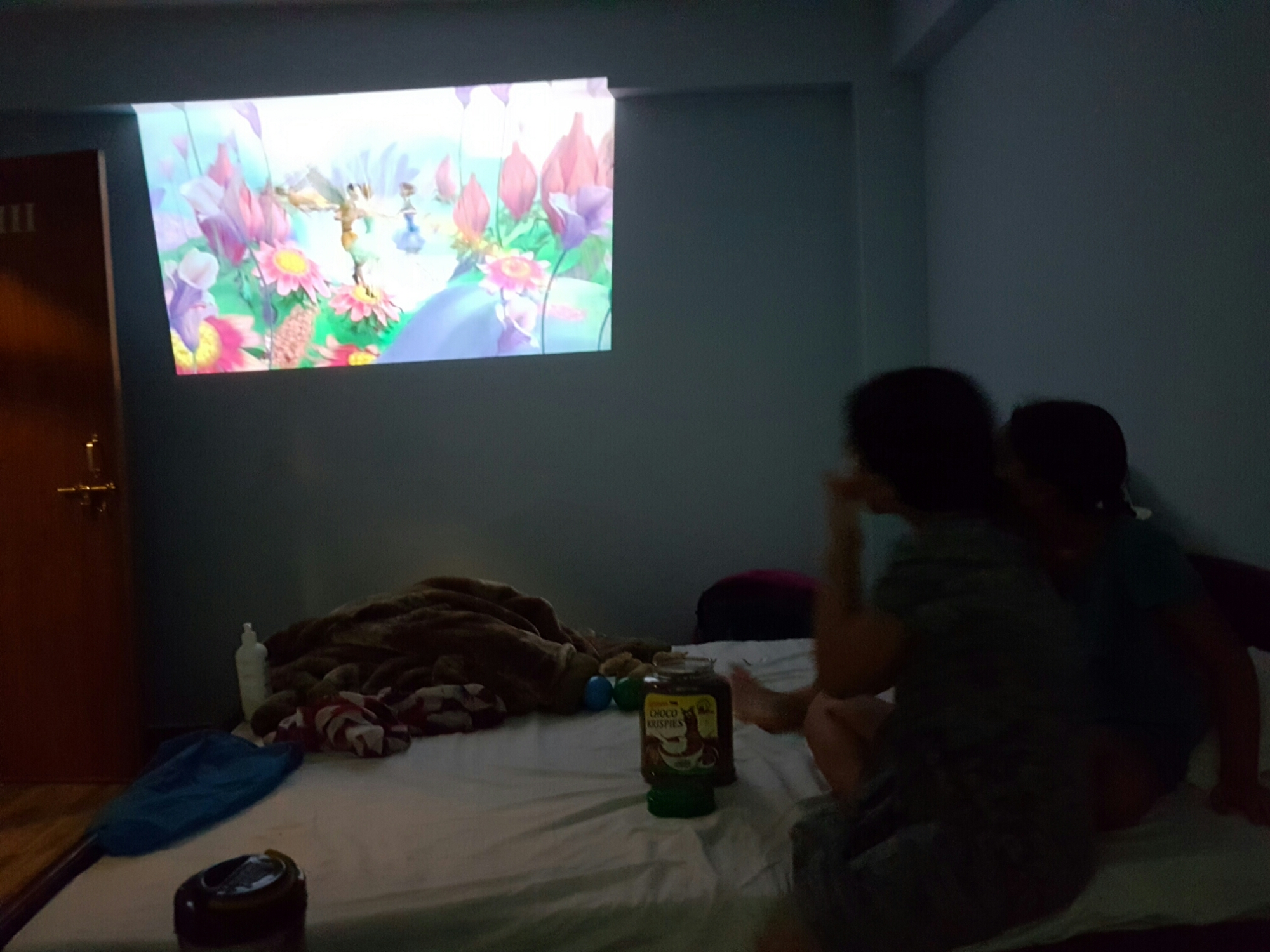 בערב, רוני ואלה קבעו עם חברות שלהן לדבר בסקייפ, ההתרגשות לקראת השיחה היתה גדולה, התקלחנו, הטענו את הטאבלט והמתנו לשעה היעודה, אחרי שהתגברנו על כל מיני בעיות טכניות בצד שלנו ובצד שלהן, הן אפילו הצליחו לשוחח קצת. היה מאוד מרגש, ואני הייתי בטוחה שהן לא יצליחו להירדם בלילה. אבל סרט על הקיר, במקרן שלנו הוריד את ההתרגשות והבנות שקעו לתוך שינה רגועה ונעימה.