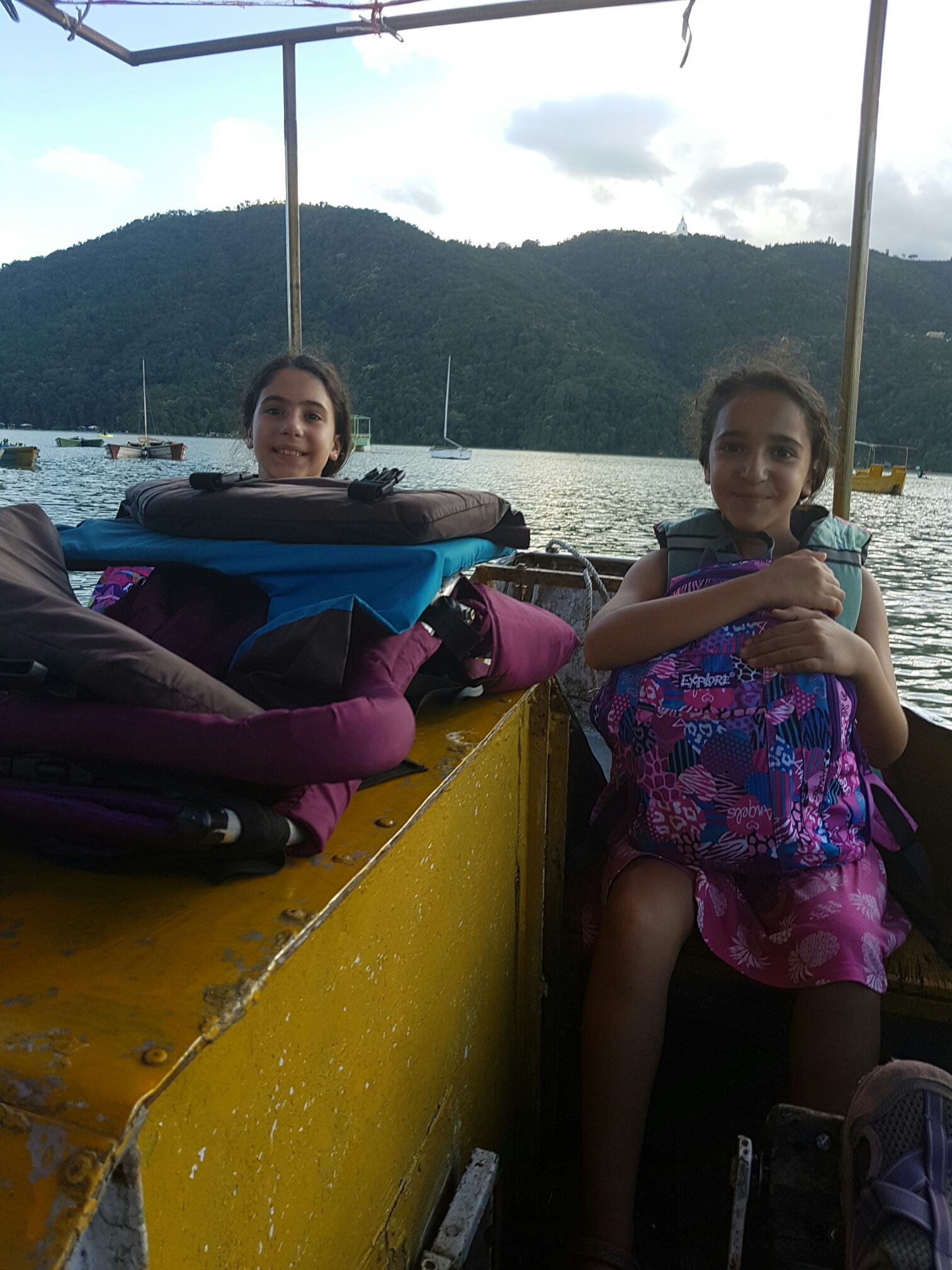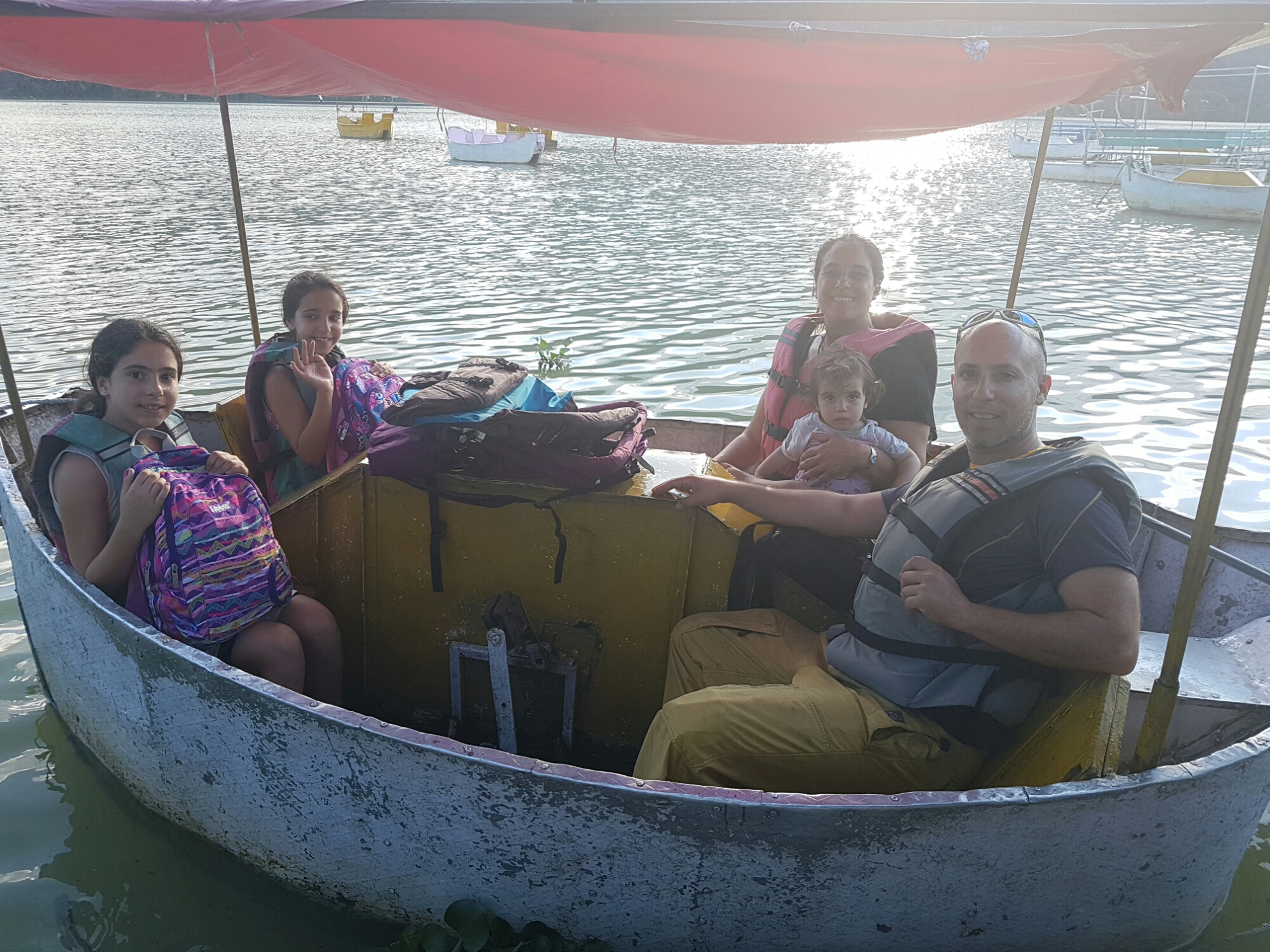 האטרקציה המרכזית בפוקרה, הוא האגם פיווה. אגב, אגם בנפאלית יש אומרים – טל. זהו אגם עצום וסביבו כפרים קטנים ובלי בו אי קטן ועליו מקדש, אז לקחנו סירת פדלים קטנה לארבעה, ושטנו לאי, יצאנו בארבע וחצי אחה"צ, במטרה להנות בדרך חזרה משקיעה "רומנטית" בתיקים לקחנו נשנושים לפיקניק כייפי, וכך היה! הנוף עוצר נשימה, בדרך פוגשים הרבה סירות מסוגים שונים; קיימים, משוטים וסירות פדלים גדולות יותר ומה לא? לא סירות מנוע! אין זיהום הכל מכני ופשוט, ככה אני אוהבת את זה. הבנות התרגשו, האוירה היתה נפלאה, הן כל כך רצו לנסות לדווש, אבל הרגליים שלהן היו קצרות מידי ולא הגיעו לפדלים. גם גלי היתה מאושרת, מה צריך יותר מזה?