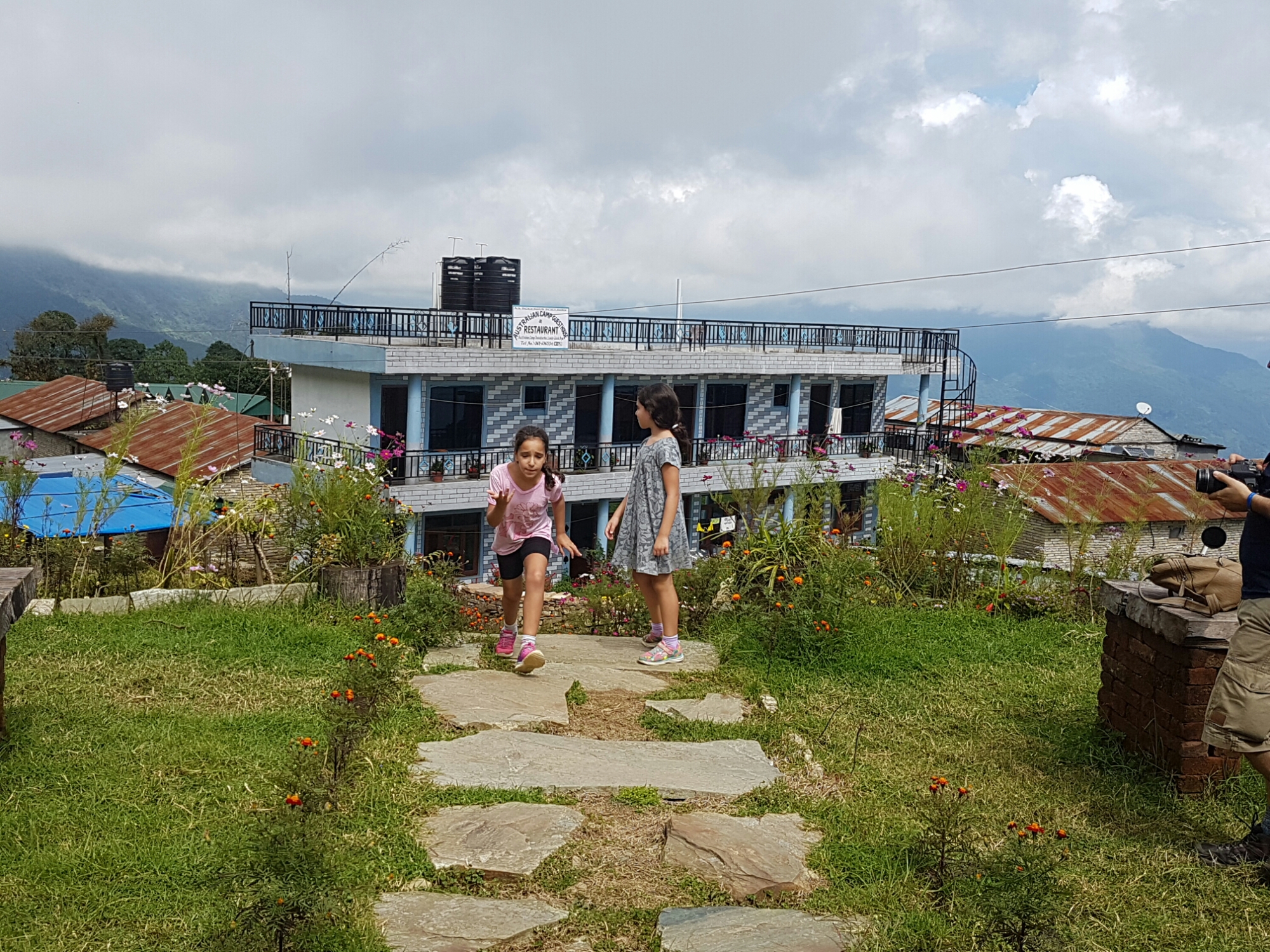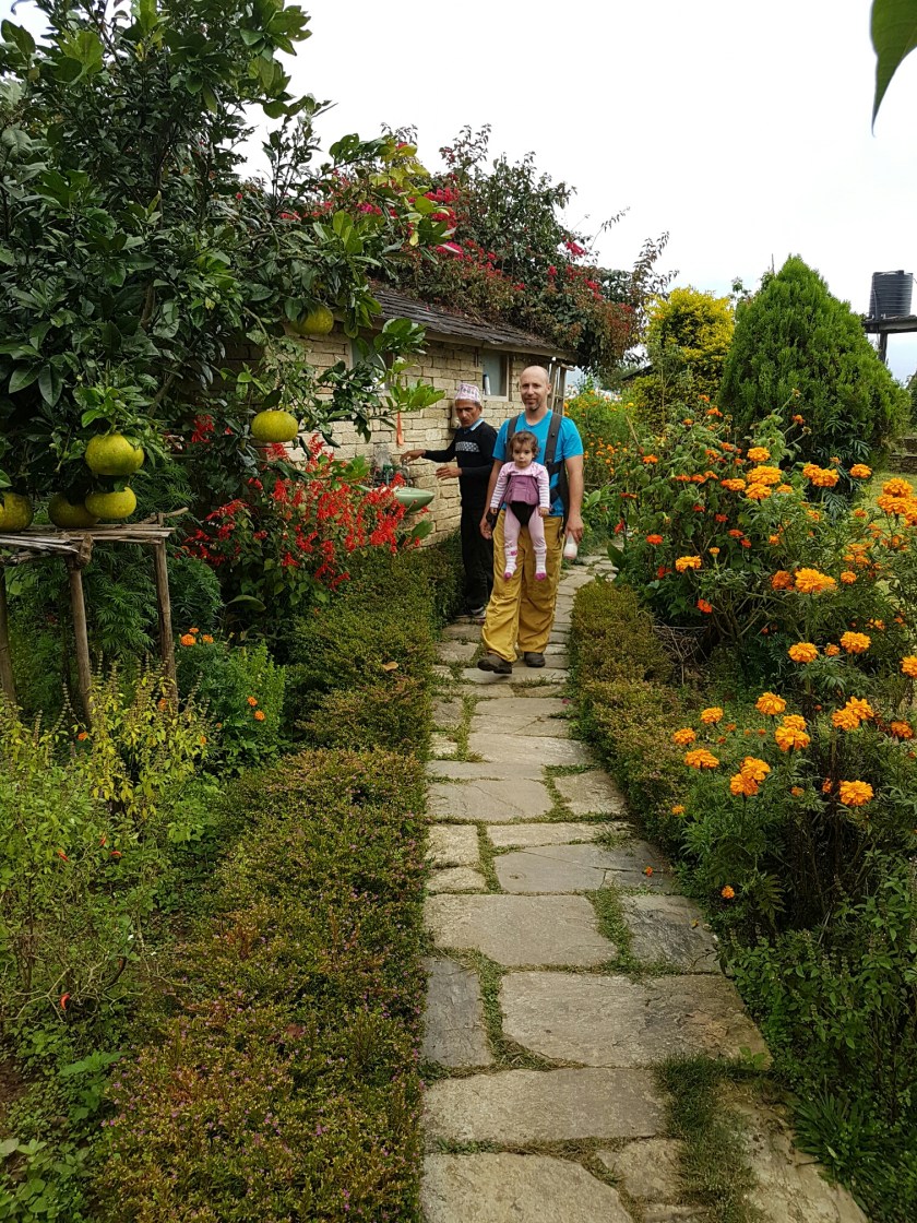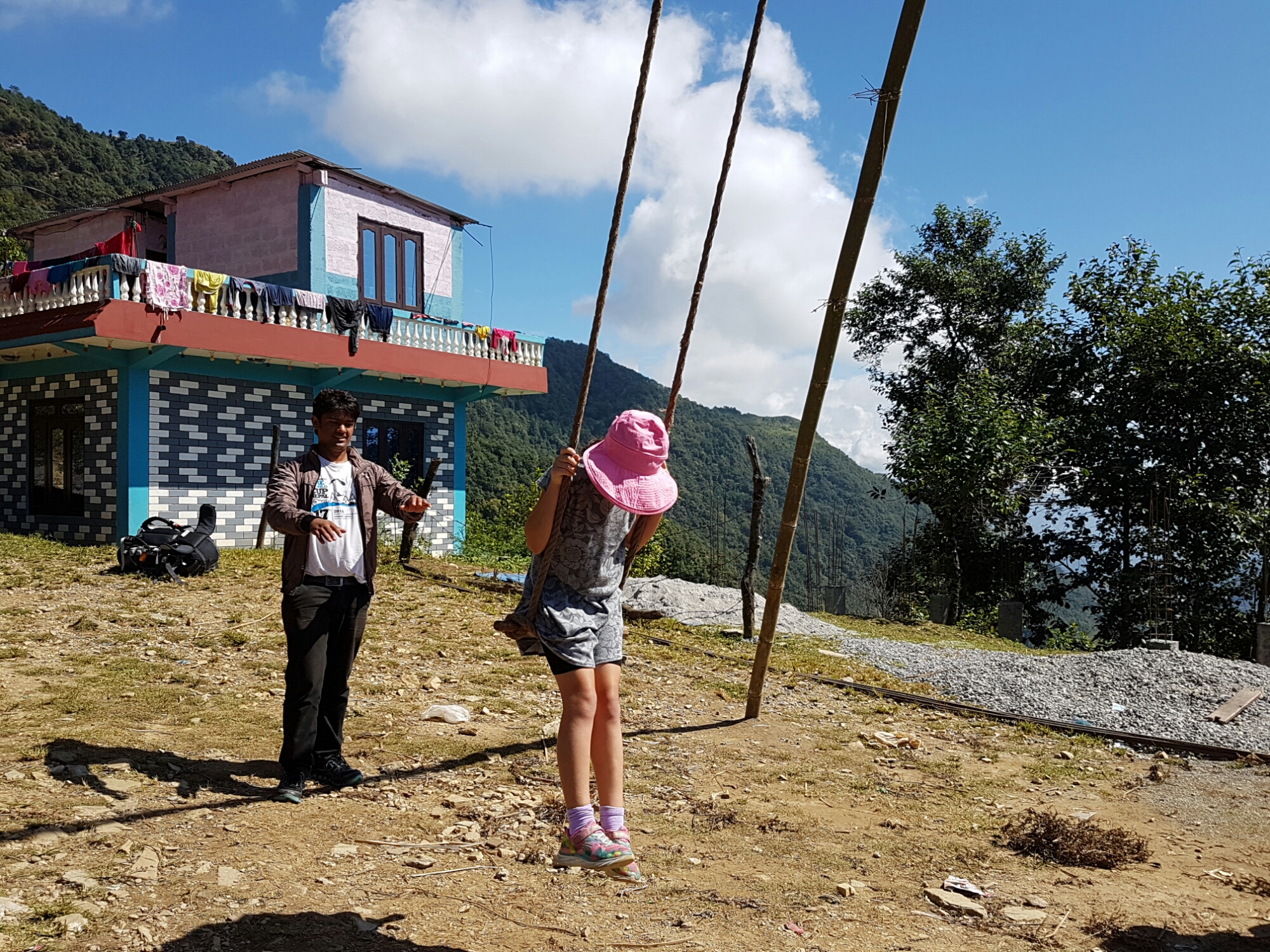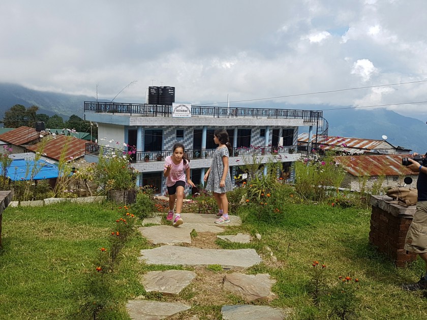 נגלה לעיננו מעין מישור מוגבה ועליו מספר גסטאהוסים, ולכל אחד מהם חצר מטופחת בדשא ובפרחים. לכל אחד היתה גם נדנדה כמו זו שראינו בדרך. הילדים התלהבו, אופיר והבנות הלכו להתנדנד והבנים/גברים הלכו לשחק כדורגל עם הנפאלים ואל תשאלו אותי מאיפה היה להם כח… אבל אמרתי לכם שלא היה יום קשה במיוחד.