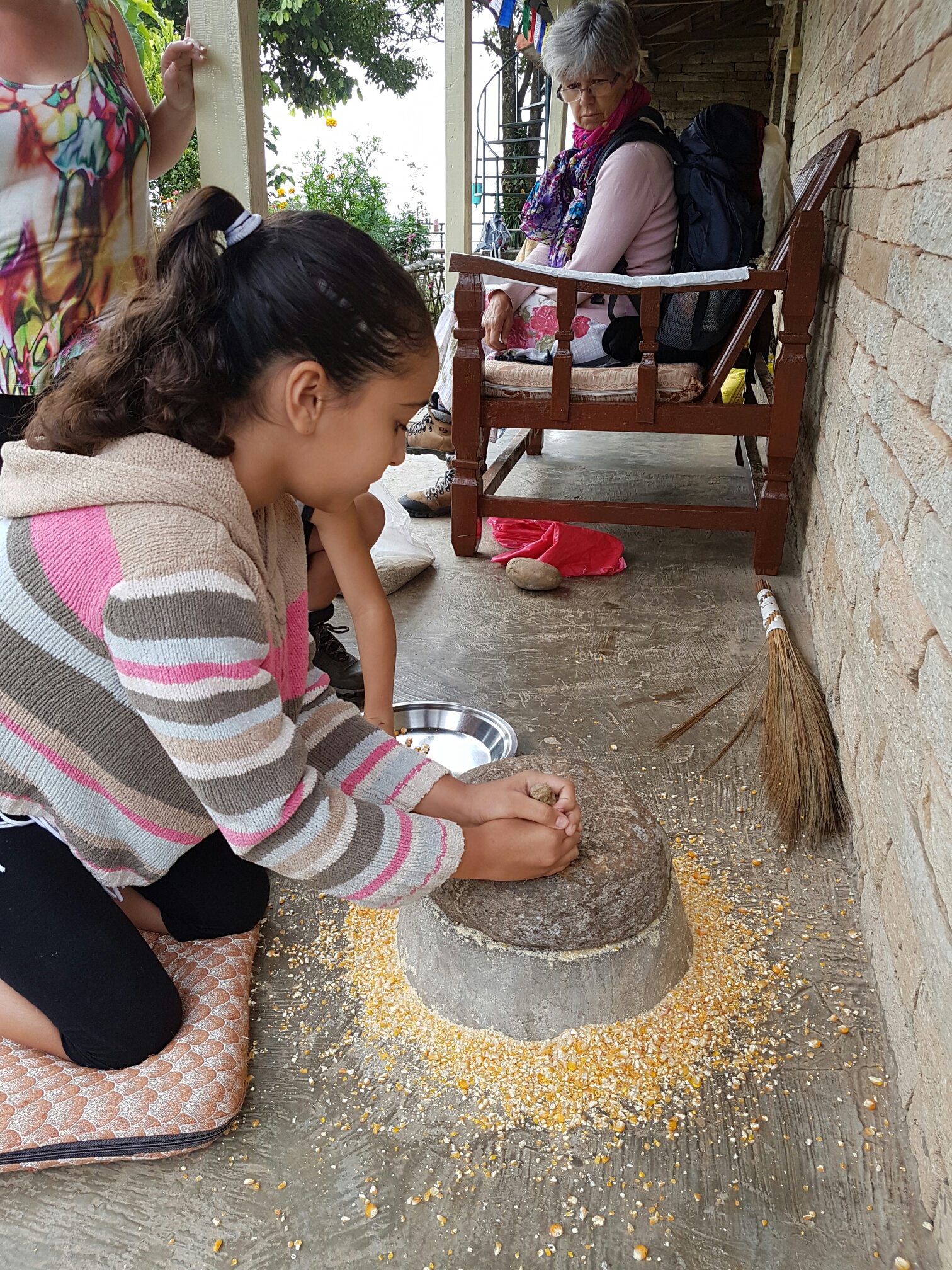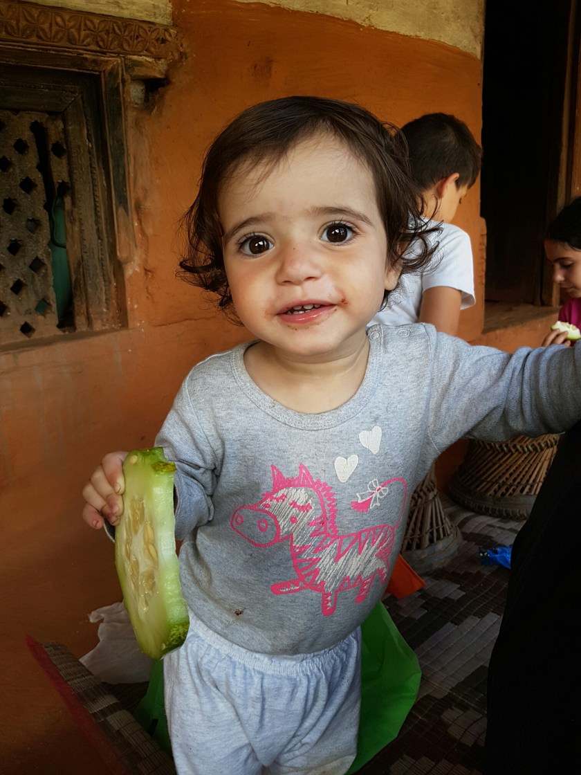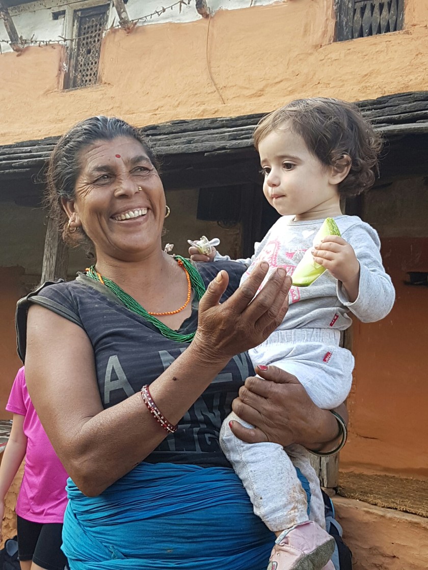 הנפאלים ידועים בהתלהבות שלהם מתינוקות, ולכל מקום שאני הולכת עם גלי תמיד יש נפאלי או נפאלית שנגשים מרימים או מלטפים, ומראים את חיבתם. גלי מצידה, בורחת (אם היא מצליחה) ובוכה לרוב. הפעם אמא של זיבאן הצליחה להרים את גלי בלי שתבכה, ואז הסבתא גם רצתה כמובן וגלי סרבה בתוקף, אבל הסבתא לא ויתרה, ניסתה שוב ושוב, קטפה לה פרחים, וניסתה לפתות אותה בכל מיני חיוכים וקולות עד שלבסוף הצליחה להרים אותה למספר שניות בתמורה לפלח מלפפון, והסבתא היתה מאושרת!