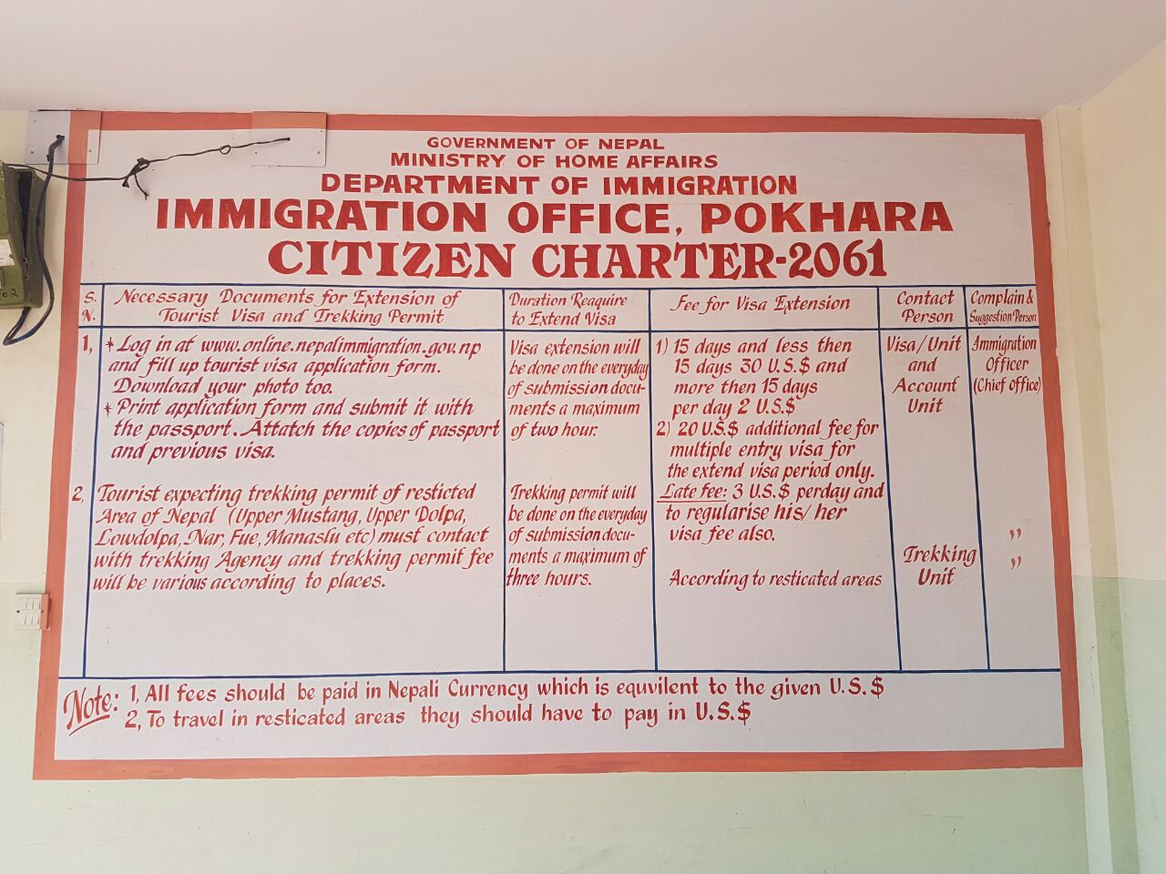 יותר מחודש בילינו בנפאל, הויזה שלנו הסתיימה אחרי 30 יום והיינו צריכים להאריך אותה. לאחר ביקור במשרדי ההגירה הבנו שיש לשלם 30$ לכל מבוגר מגיל עשר ומעלה. למזלנו רק מואב ואני היינו צריכים לשלם, קיבלנו הארכה של 15 יום נוספים. בעבור יום האיחור שילמנו קנס של 3$ לכל אחד כולל הילדים(!).